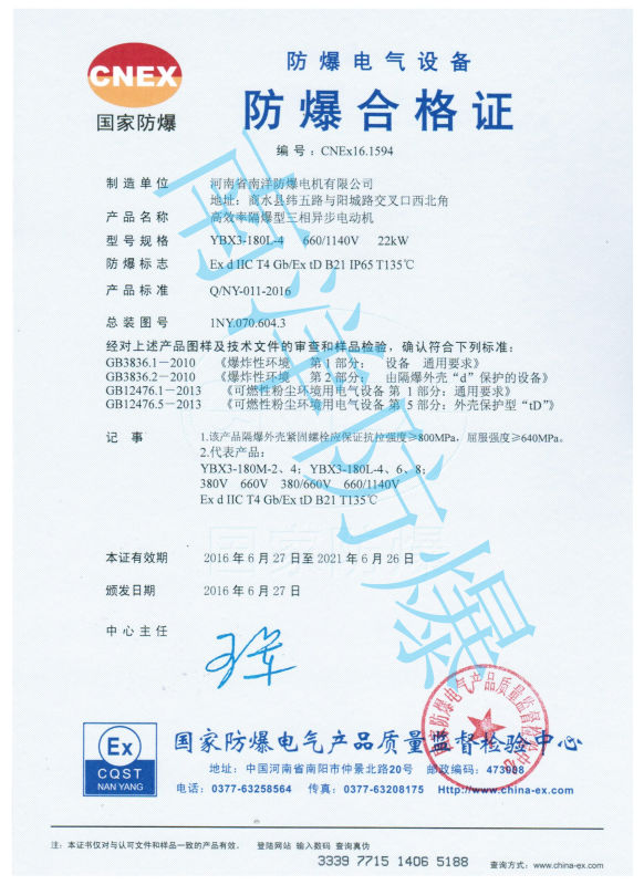 YBX3系列隔爆型粉塵防爆三相異步電動機(機座號63~355)(以下簡稱電動機),按照GB3836.1-2010《爆炸性環(huán)境 第1部分:設(shè)備 通用要求》和GB3836.2-2010《爆炸性環(huán)境 第2部分:由隔爆外殼“d”保護的設(shè)備》GB 3836.3-2010《爆炸性環(huán)境 第三部分:由增安型e保護的設(shè)備》的要求,制成隔爆型,防爆標志為:Ex tD B21 T135℃,可以覆蓋Ex tD B22 T135℃、Ex tD A22 T135℃、Ex tD A21 T135℃,可以替代YFB系列DIP B21 TB,T4/DIP A21 TA,T4的粉塵防爆電機。適用于存在可燃性粉塵場所和可燃性飛絮的場所。粉塵防爆電機選型要結(jié)合電機使用場所的粉塵區(qū)域來選定。